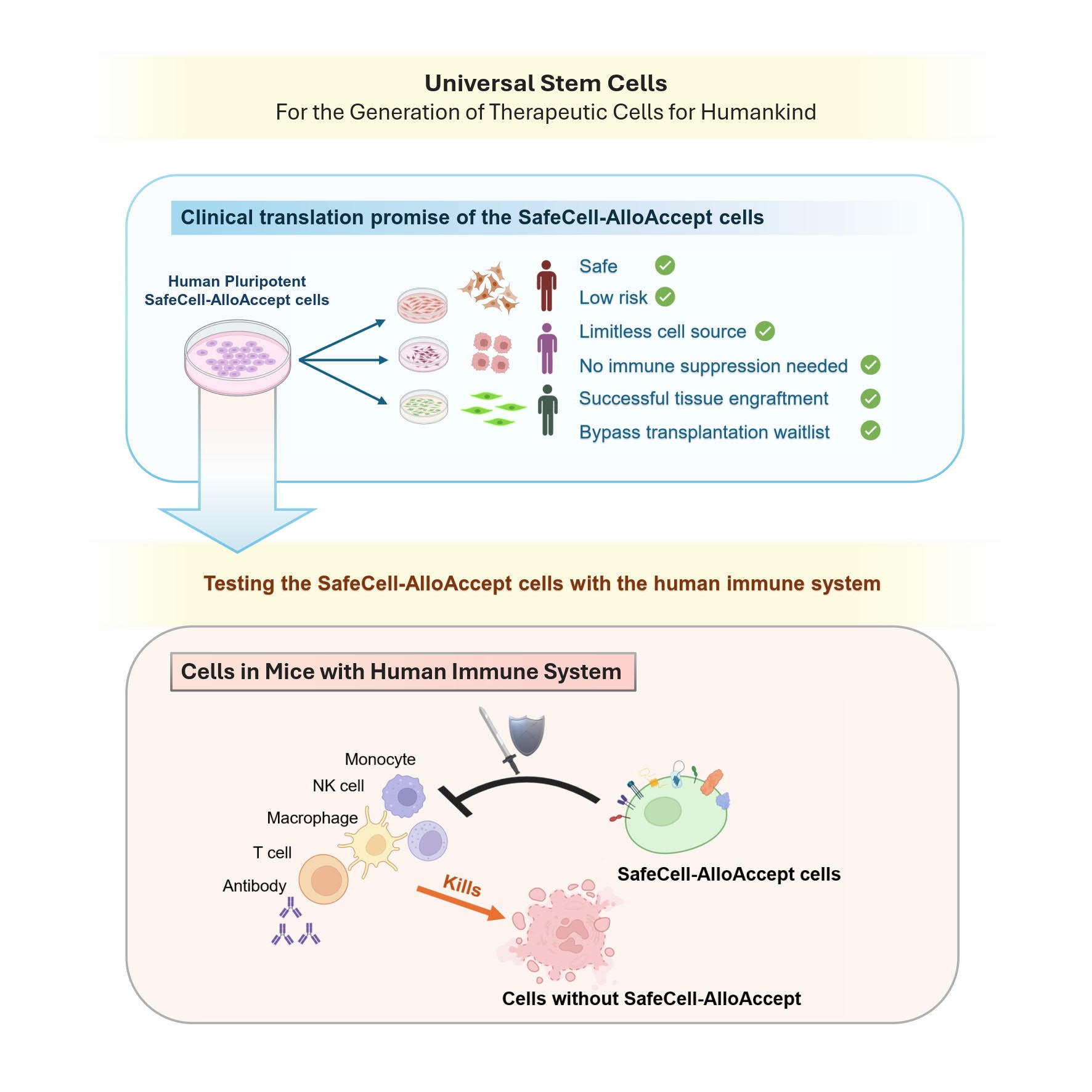The FailSafe-AlloAccept human pluripotent embryonic stem cells can become almost any cell type in the body, offering a potentially limitless supply of replacement cells. However, repeated cell divisions can introduce mutations, causing cancerous cells.